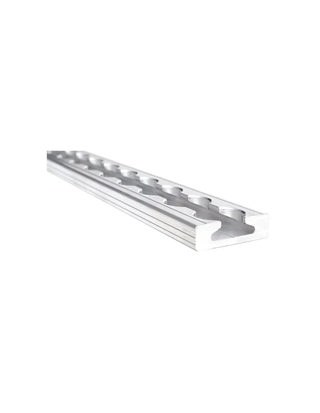 Perfil o riel aluminio rectangular de perfil bajo 9'6 mm aeronáutico, en tramos de 2 metros, para montaje empotrado (suelos) o en superficie nos permite un sinfín de puntos de anclaje para tener un buen amarre de nuestra carga. Resistencia LC cuando se fija: cada 75 mm en el centro con un tornillo avellanado M5 DIN 7991 10,9